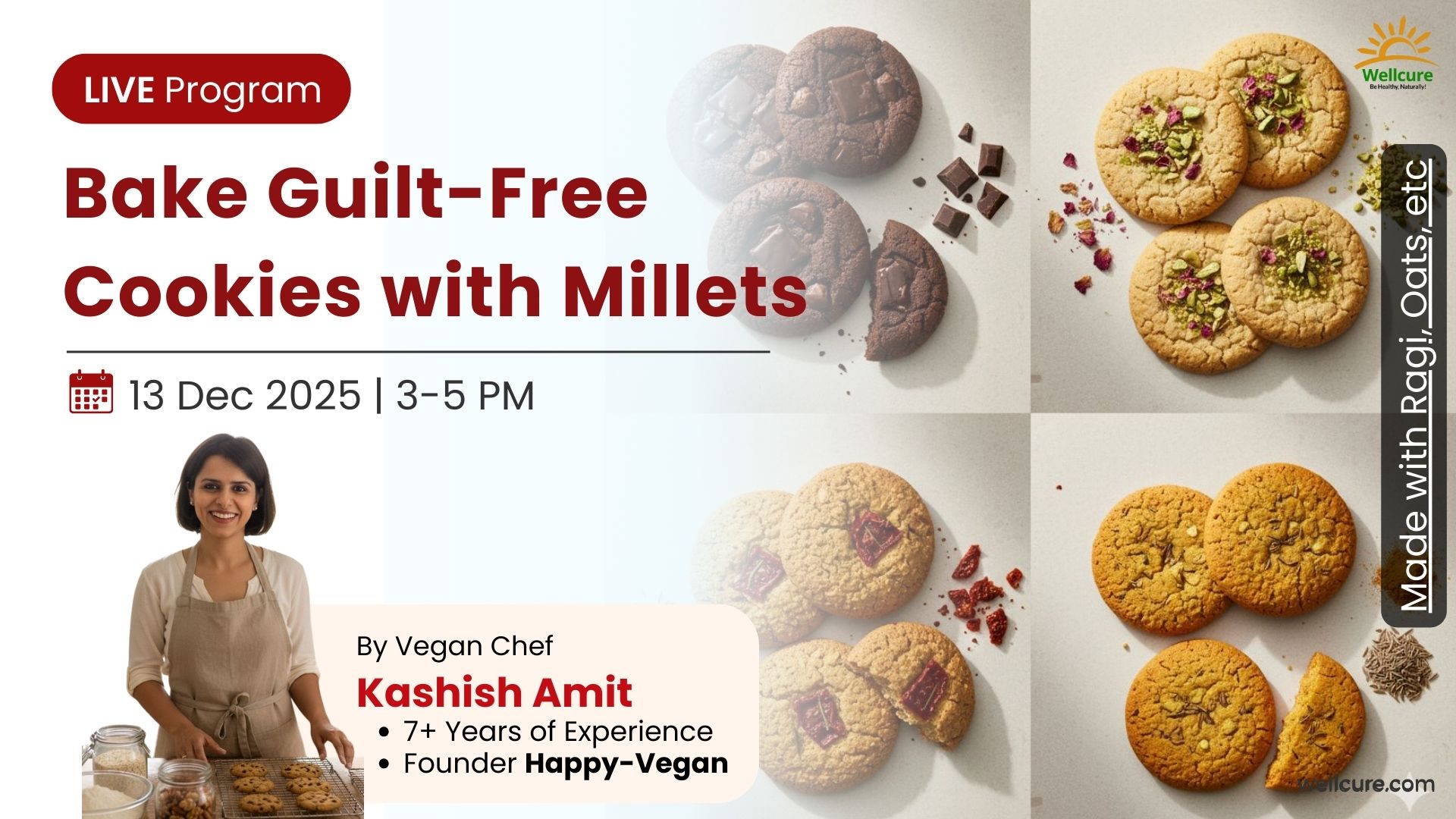 Learn to bake gluten-free, sugar-free, dairy-free cookies using wholesome millets like ragi, oats, sattu & more.