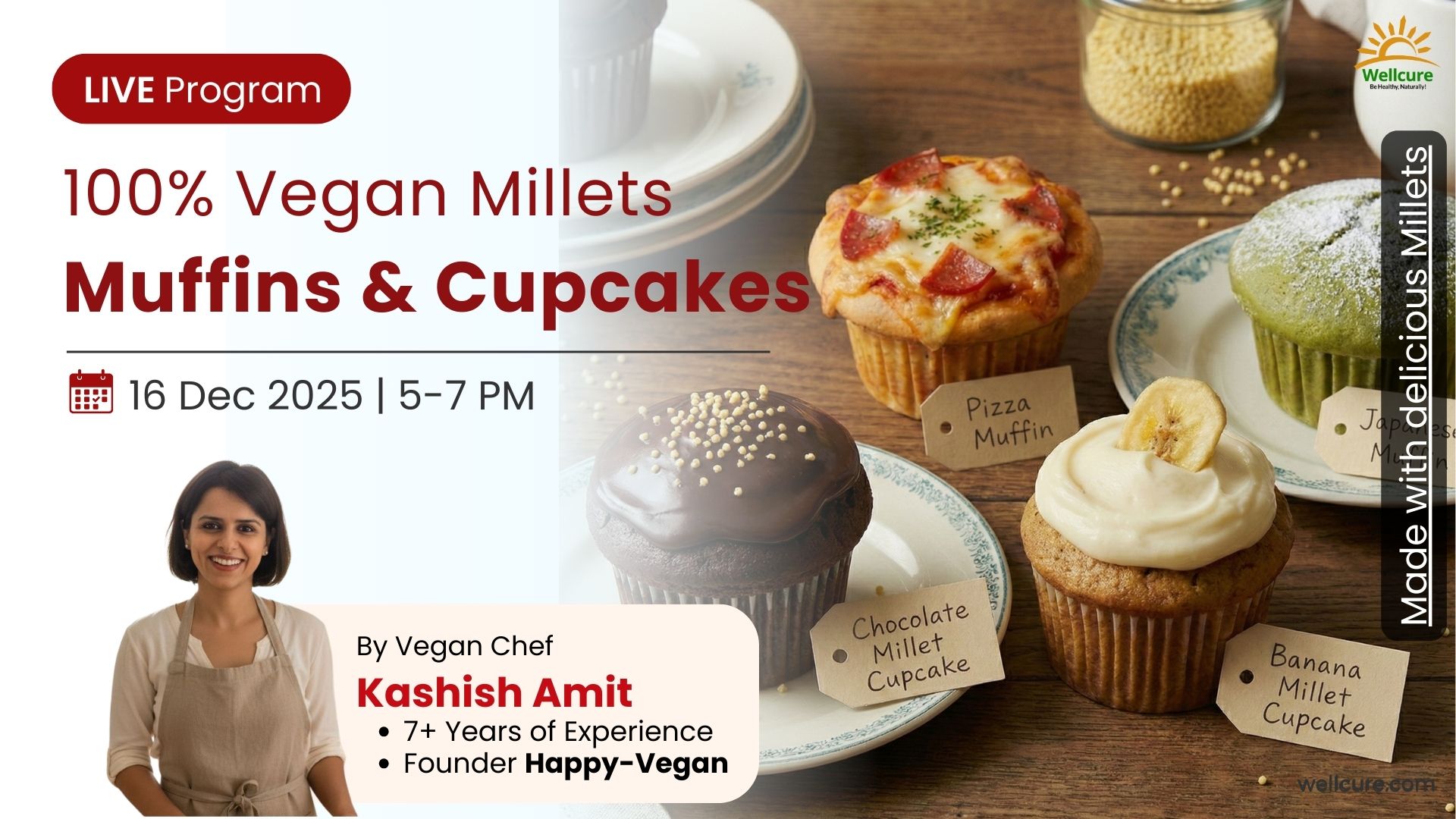 Learn to bake soft, delicious, gluten-free, and vegan millet muffins & cupcakes at home. This 2-hour LIVE workshop teaches 4 healthy, beginner-friendly recipes using millets—no refined sugar, no maida, 100% guilt-free!