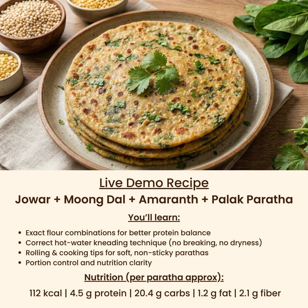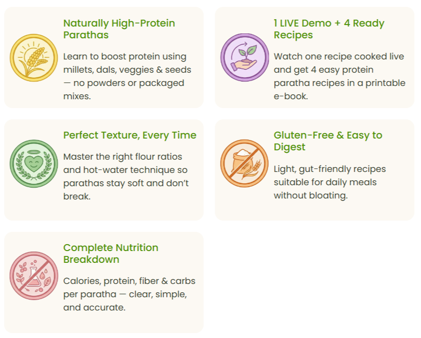 This workshop shows you how to make naturally protein-rich parathas using millets, dals, greens, and vegetables — perfect for breakfast, lunch, or tiffin.