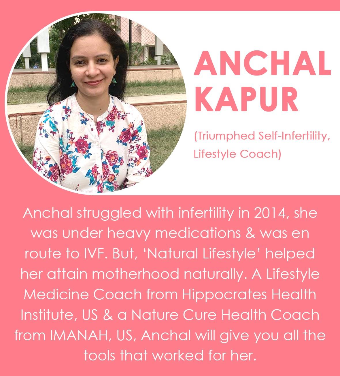 Anchal struggled with infertility in 2014, she was under heavy medication for hormonal imbalance & was en route to IVF. But adopting a Natural Lifestyle helped her attain motherhood naturally. She is a Lifestyle Medicine Coach from Hippocrates Health Institute, US & a Nature Cure health coach from the International Institute of Mahayoga & Natural Hygiene, US. During this program, she will share her journey and all the tools that helped her bounce back from nadir to the zenith.